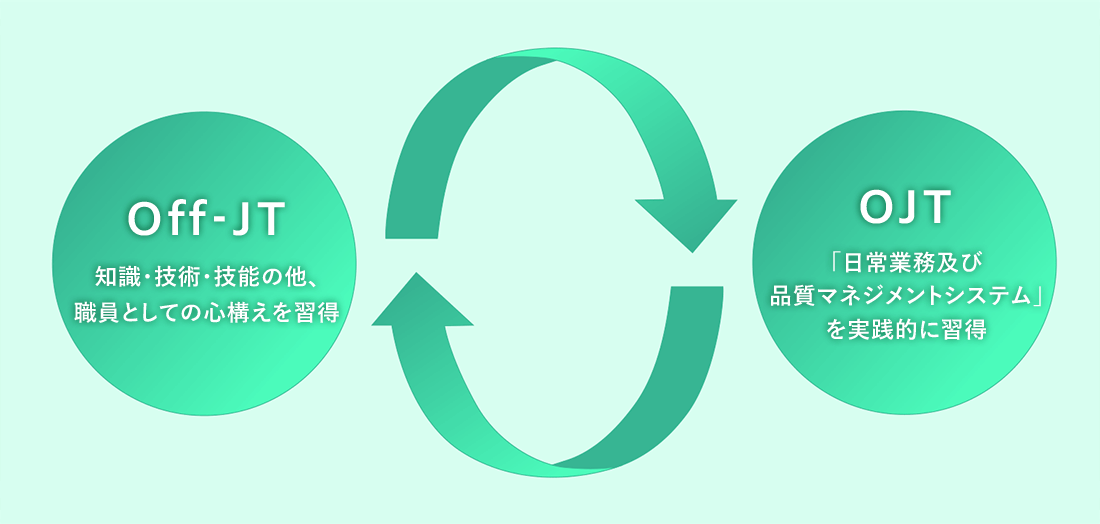 職員一人ひとりが専門職として成長し、質の高い医療サービスを提供できるよう、「Off-JT」と「OJT」を組み合わせた研修体制を整えています。両研修をバランスよく組み合わせることで、知識と実践力の双方を備えた人材の育成を目指しています。